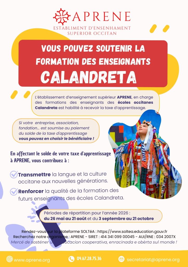 L’establiment d’ensenhament superior APRENE, cargat de la formacion dels regents de las escòlas Calandreta es abilitat a percebre lo sòlde de la taxa d’aprendissatge.